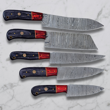 Pro Chef Knife Set of 5 in Damascus Steel | Red Pakka Wood Handle