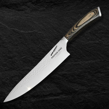 "This is a very nice 8" Chef Knife and a nice touch with the hand hammered look to it. The handle is wood and has a nice grain pattern. Hidden blade attachment gives a nice clean look to the handle with no rivets of tang line. Butt of the knife is metal and is a perfect fit with no undercut or over cut of the wood handle.