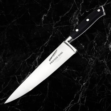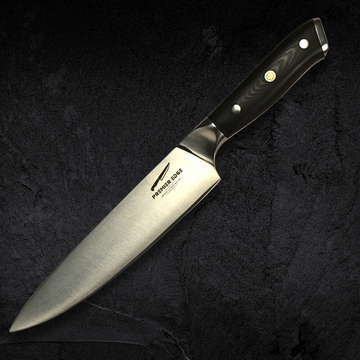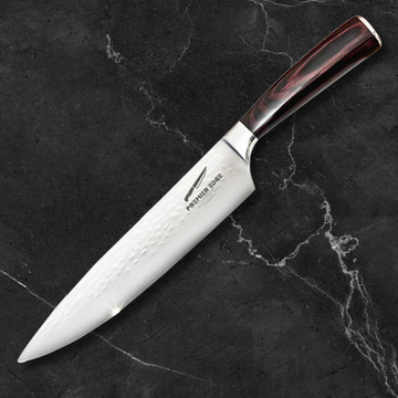 " I enjoy cooking and part of what I enjoy is the preparation. This 8 Inch-High Carbon Stainless Steel Chef's Knife is a whiz in the kitchen. It's substantial but not overly heavy and it is very sharp. The blade has a forged hammer design and is highly polished to a mirror-like finish. The weight is perfect for me. Heavy enough to be effective, yet light enough not to cause any fatigue. The handle fits perfectly in my hand.